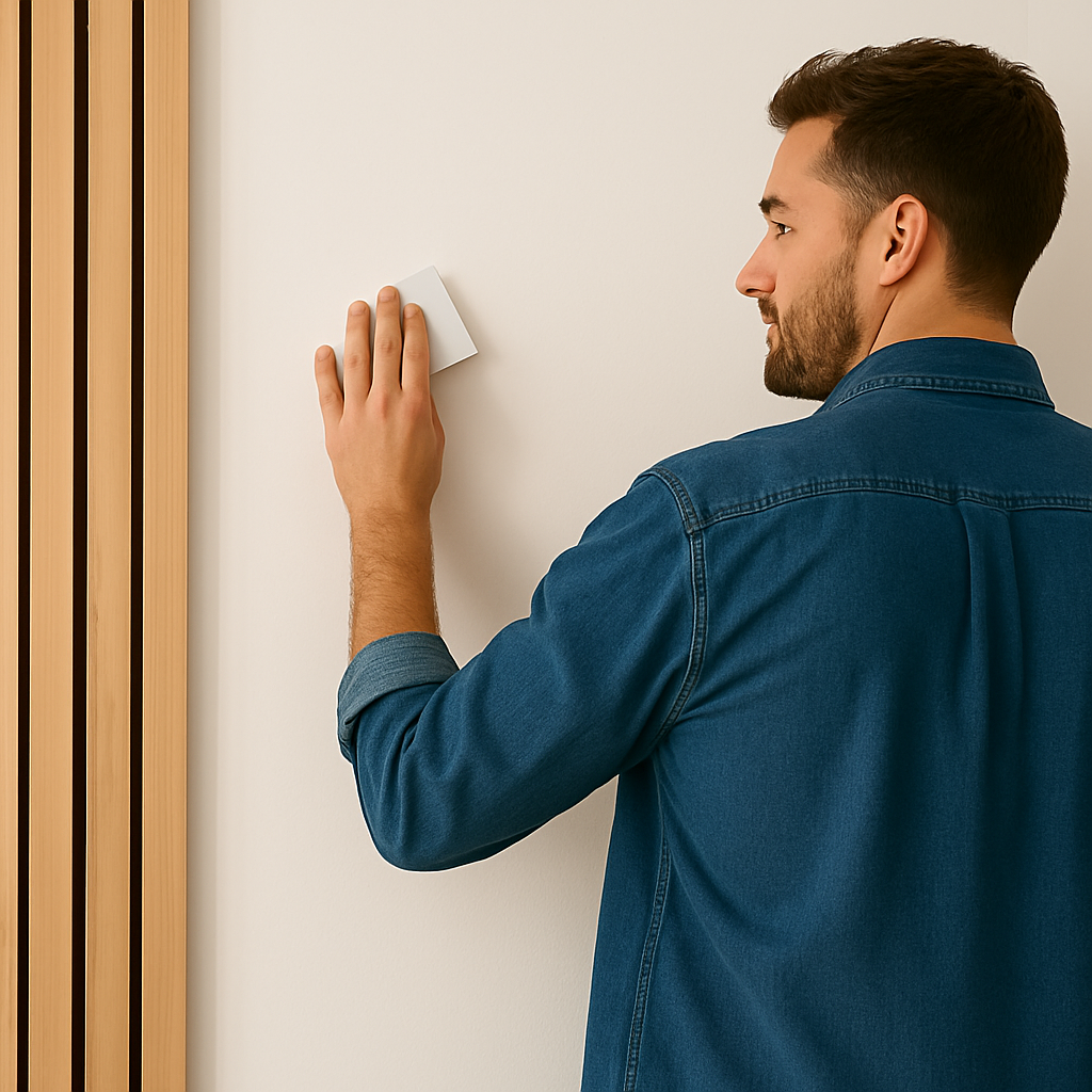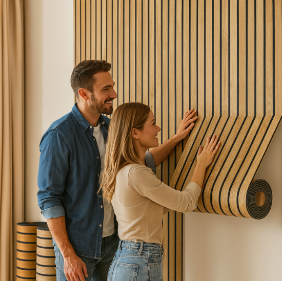 Akustikpaneel mit realistischer Holzstruktur, selbstklebend. Kein Papiermaterial – gefertigt aus widerstandsfähigem, strukturiertem Verbundstoff. (300 cm x 40 cm)