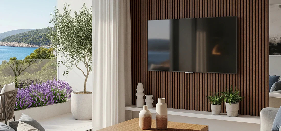 Verleihen Sie jedem Raum einen Hauch von Eleganz und Komfort mit diesem vielseitigen Lamellenpaneel. Es ist die ideale Wahl, um Stil und Funktionalität zu vereinen.